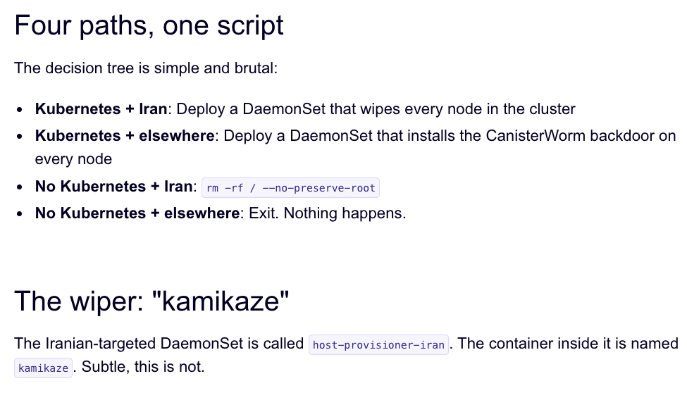 Over the weekend, the same technical infrastructure TeamPCP used in the Trivy attack was leveraged to deploy a new malicious payload which executes a wiper attack if the user’s timezone and locale are determined to correspond to Iran, said Charlie Eriksen, a security researcher at Aikido. In a blog post published on Sunday, Eriksen said if the wiper component detects that the victim is in Iran and has access to a Kubernetes cluster, it will destroy data on every node in that cluster.